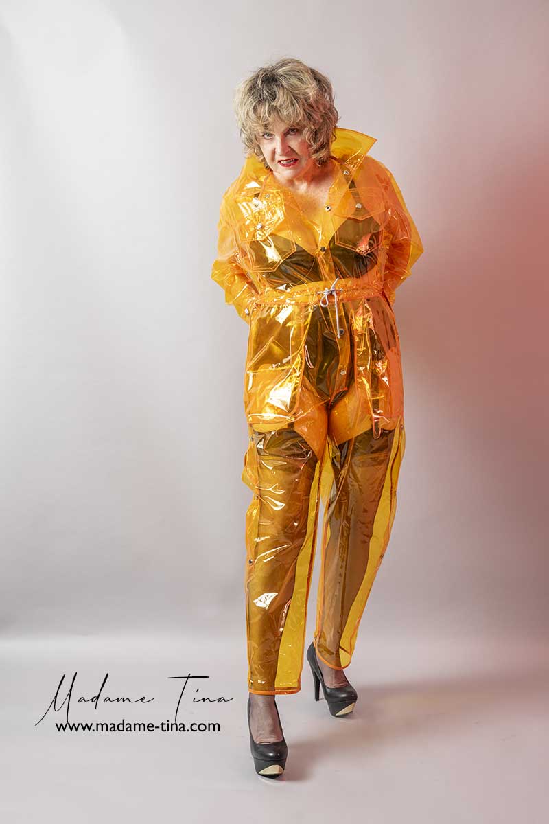 I look chic and can get dressed quickly in this yellow PVC jumpsuit. You can see my latex underwear through the transparent fabric. Cool, isn't it?